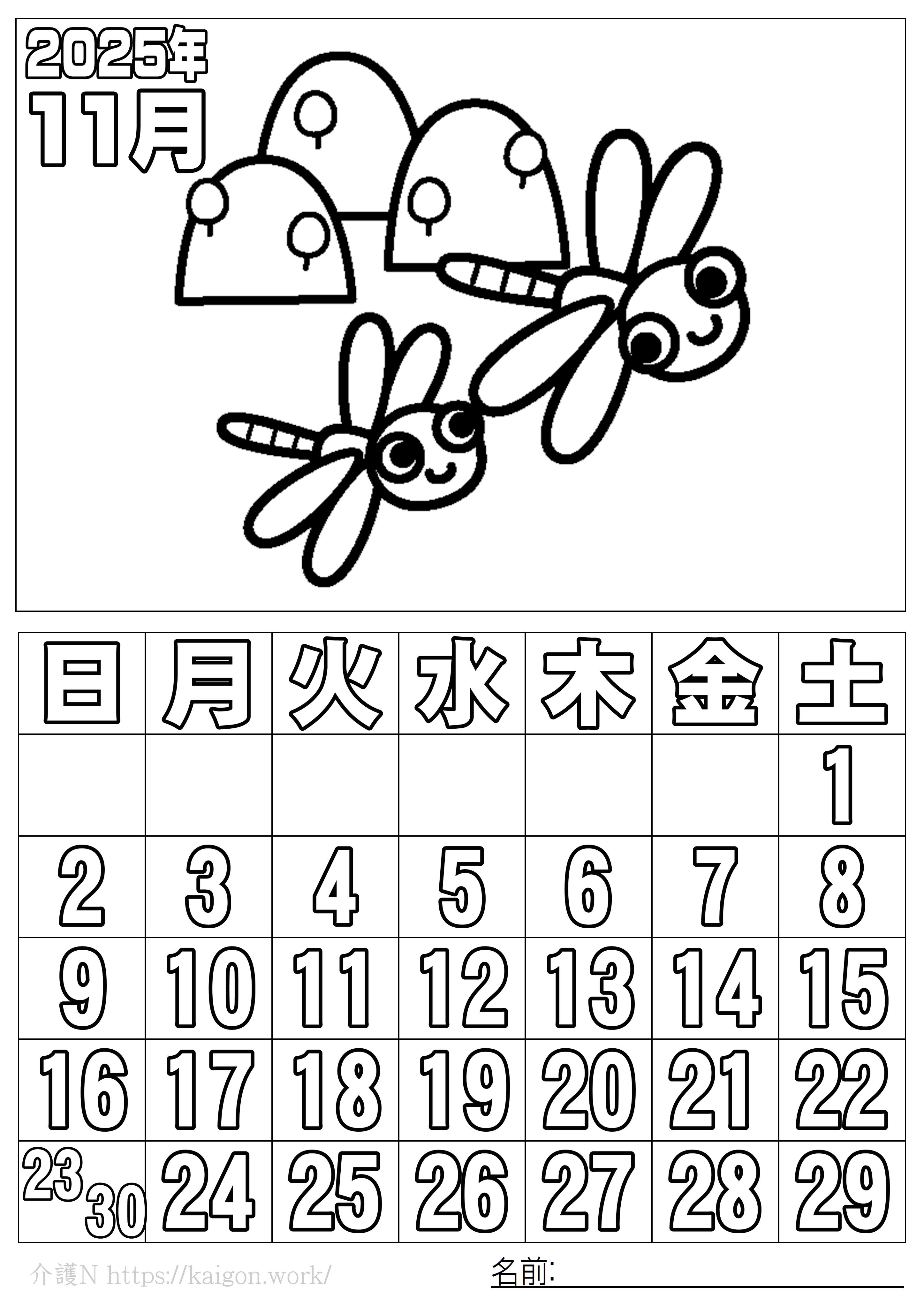 2025年11月 ぬり絵カレンダー とんぼ です。