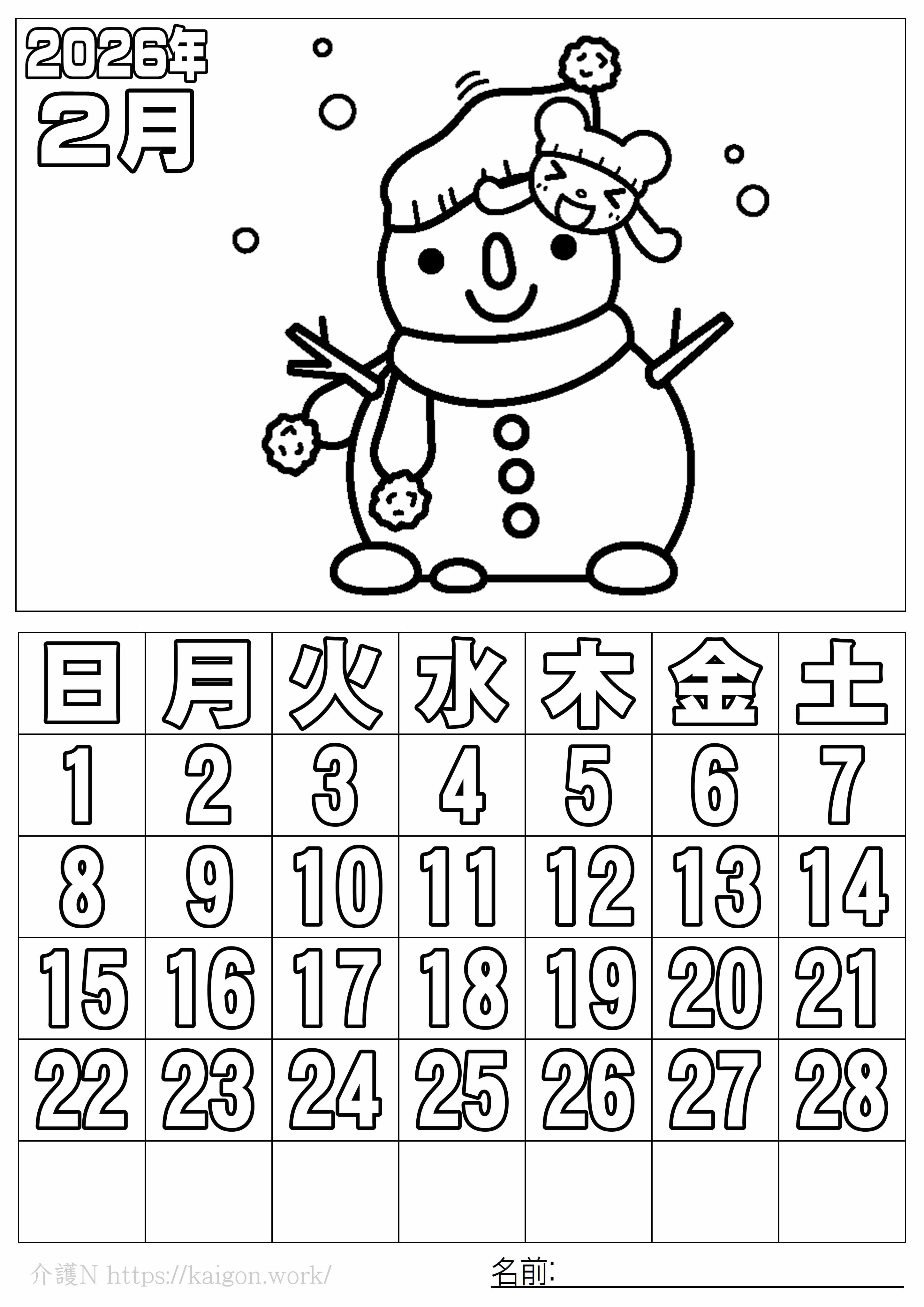 2026年2月 ぬり絵カレンダー ゆきだるま です。