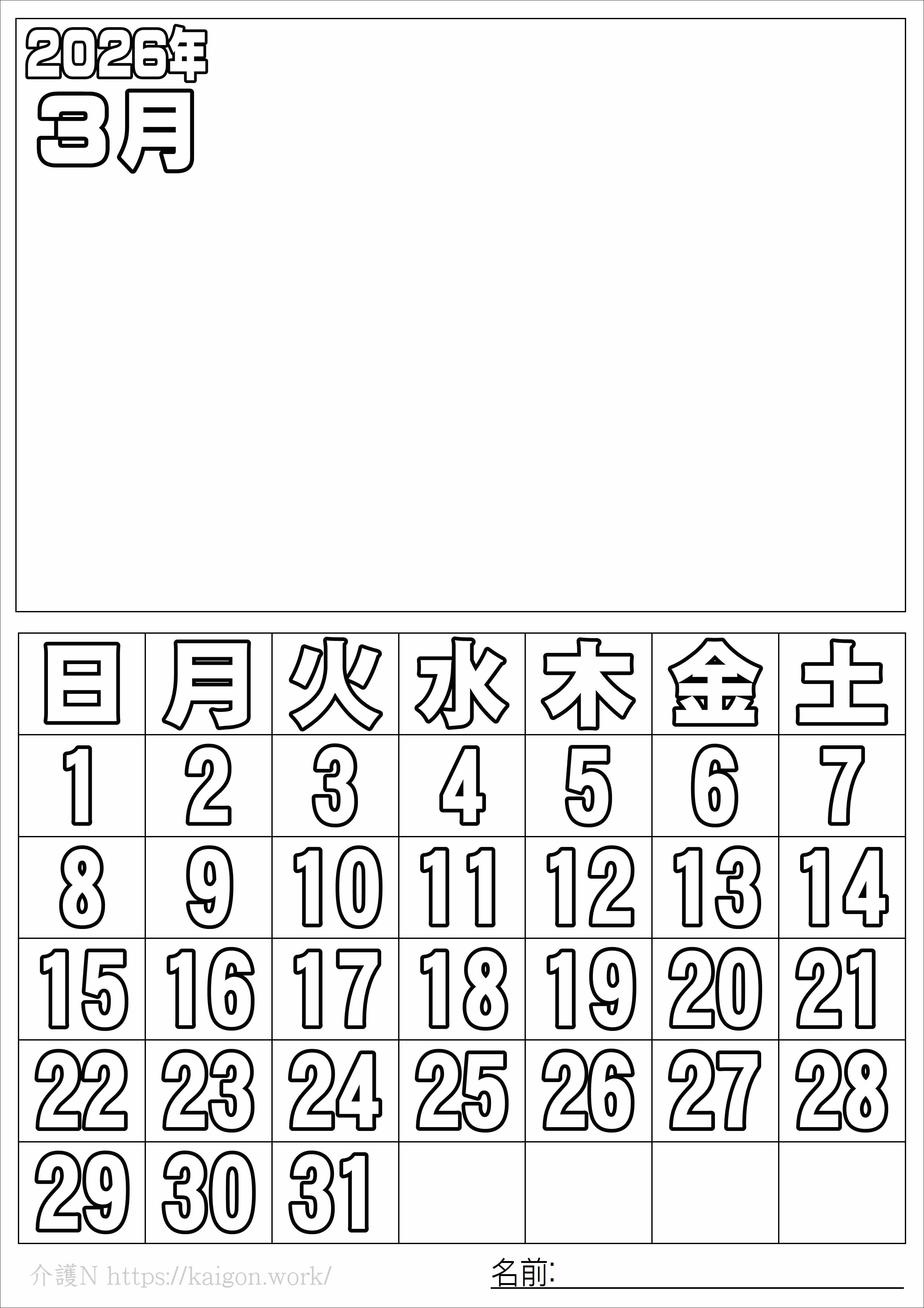 2026年3月 ぬり絵カレンダー もぐらとつくし です。