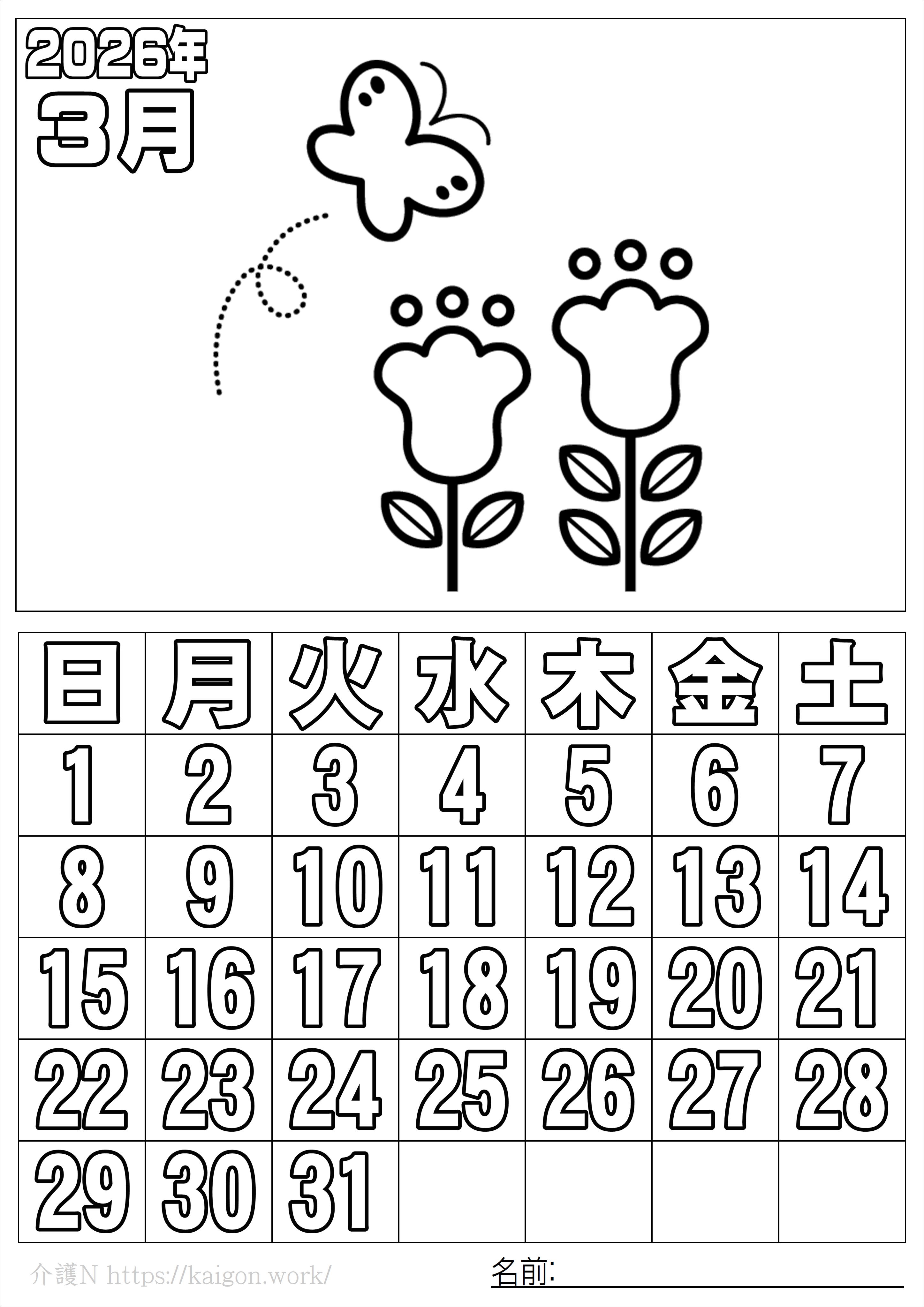 2026年3月 ぬり絵カレンダー 蝶とチューリップ です。